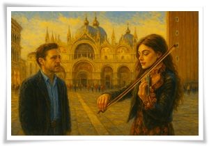 «Franco Scarpa si muove in un registro lirico intenso e raccolto, dove musica, identità e città si fondono in un’unica corrente emotiva. Il testo è costruito come un racconto poetico che segue una figura femminile – violinista solitaria – nel suo rapporto intimo con l’arte e con Venezia. Versi che catturano»